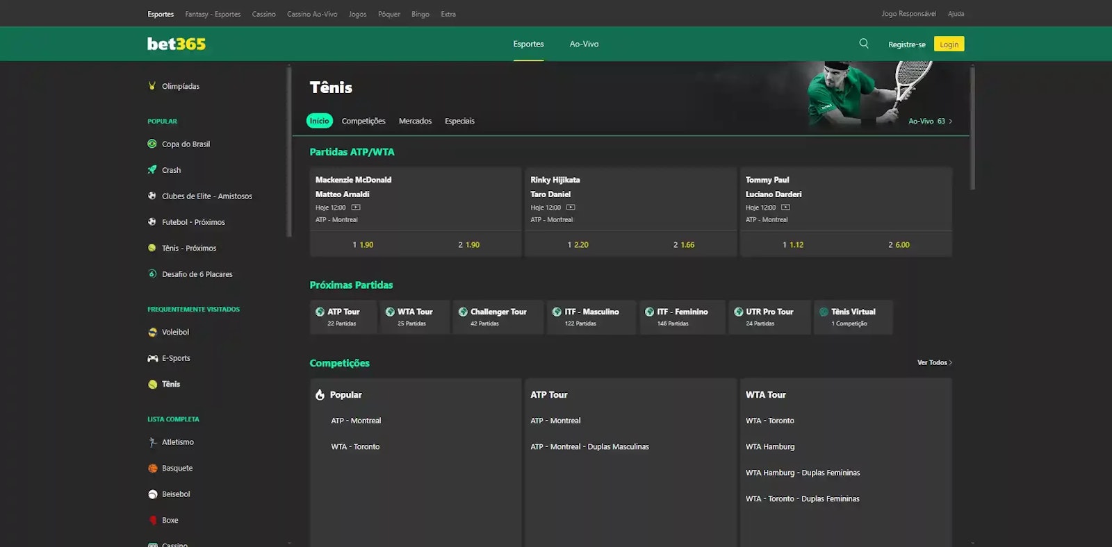 Na Bet365 você também vai encontrar uma das maiores coberturas de transmissões ao vivo com imagens dos principais torneios de tênis.