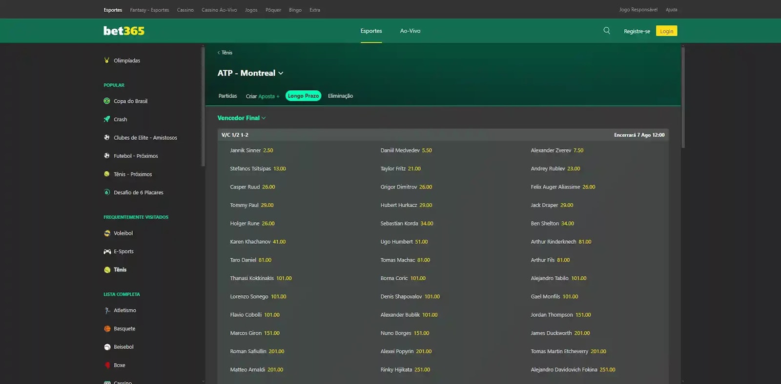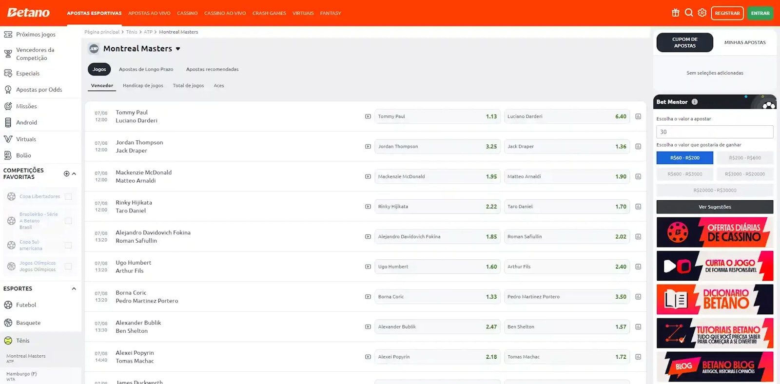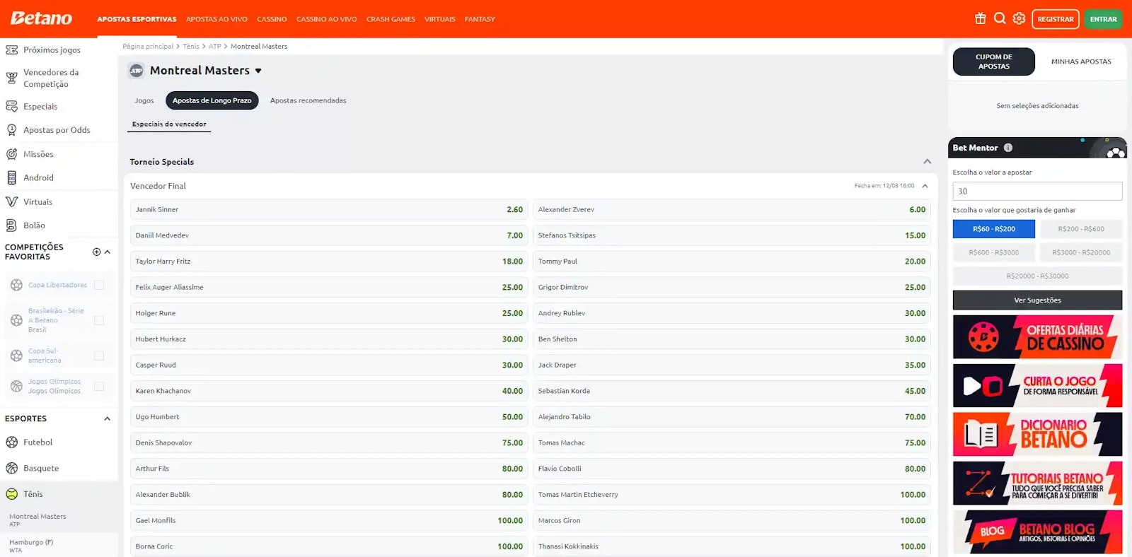 Com relação ao tênis, não poderia ser diferente. A Betano se destaca ao oferecer diversos mercados de apostas para essa modalidade.