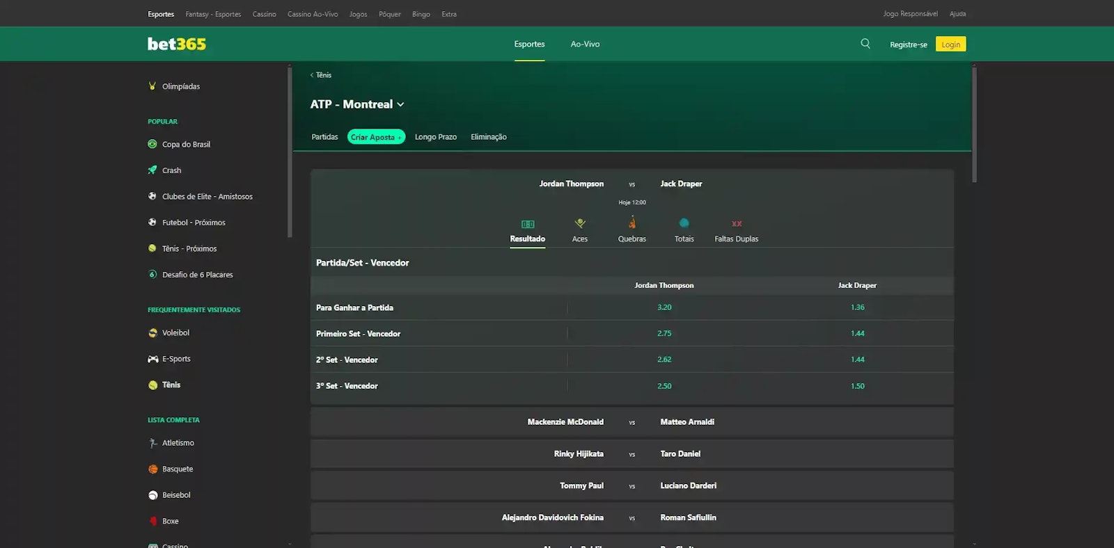 Nas apostas em tênis, a Bet365 oferece uma boa quantidade de mercados, cobrindo as opções de apostas em quebras, aces e faltas duplas.