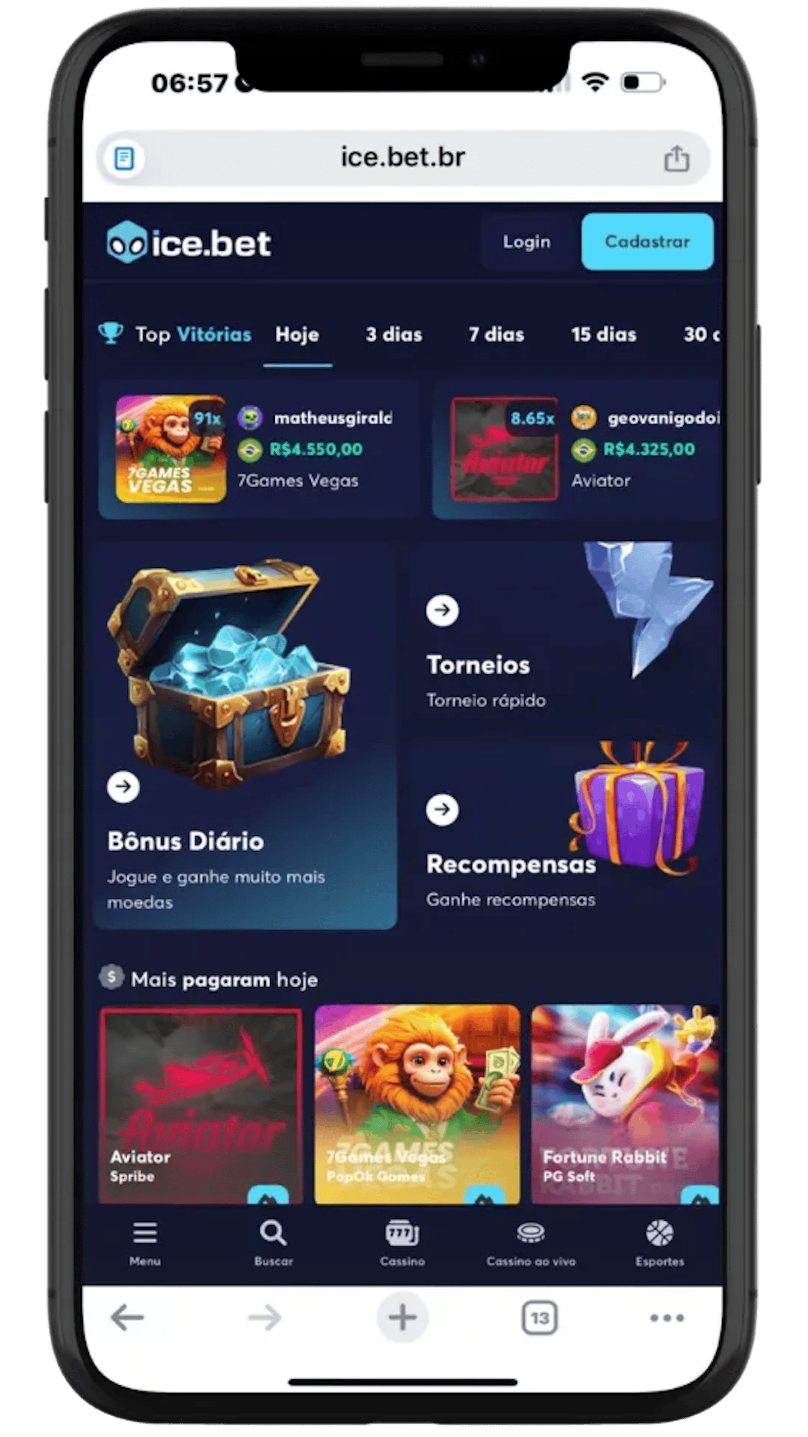 A ice.bet.br destaca-se no cenário brasileiro por um bom catálogo de cassino online e opções de apostas esportivas. Com um design moderno e navegação fácil, a plataforma garante uma boa experiência ao usuário. Além de um Clube Vip com vantagens para jogadores frequentes, o site oferece suporte ágil e transações seguras via PIX, trata-se de uma escolha confiável, mas pouco atrativa para apostadores esportivos.