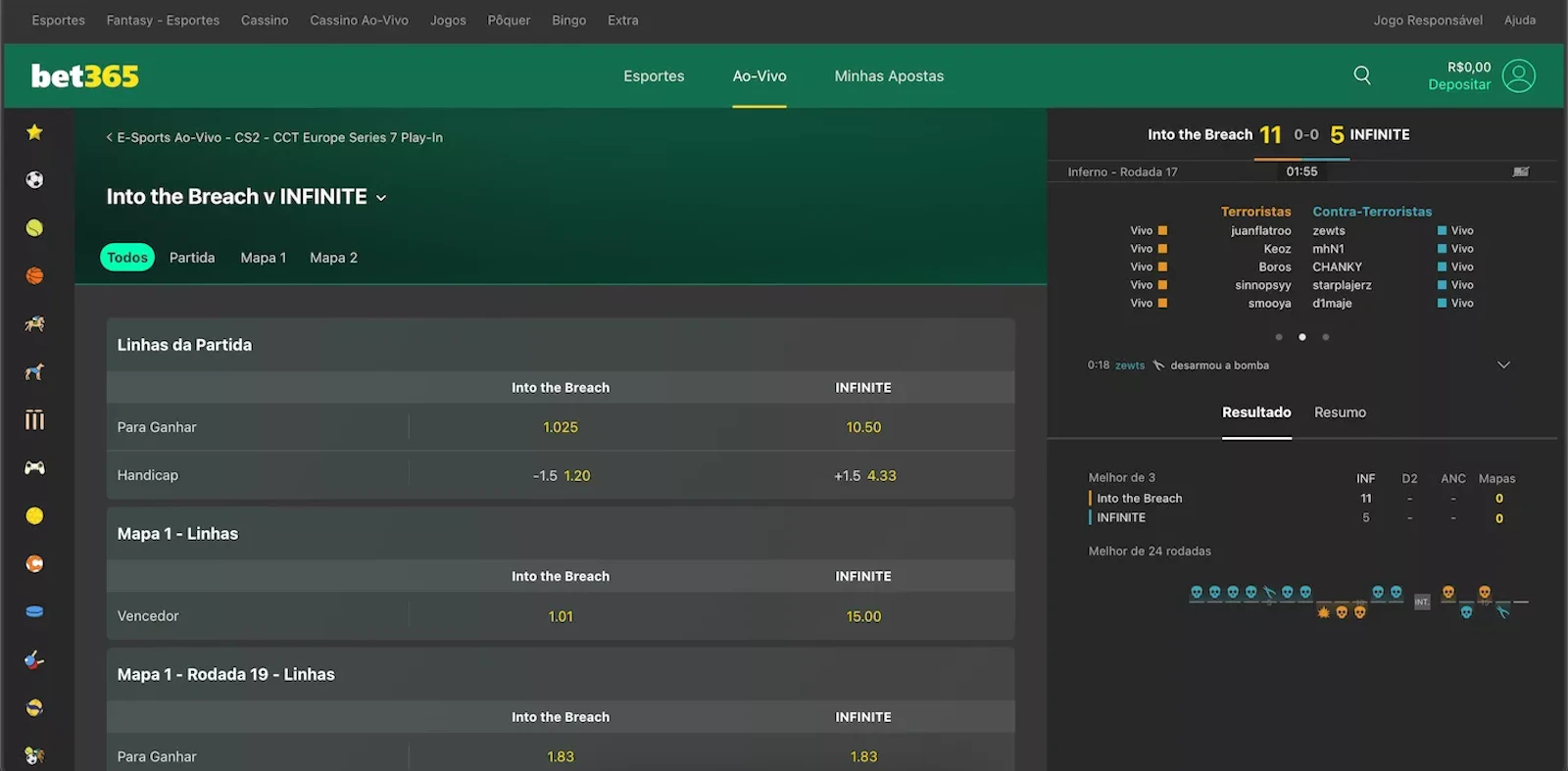 - Vetos e o conforto do mapa: no CS2, a vantagem de começar no lado favorável do mapa (ex: CT na Nuke ou TR na Anubis) é brutal para o momentum. Use sites que permitem apostas em "Vencedor da 1ª Metade" para capitalizar sobre times que escolhem o lado forte primeiro.