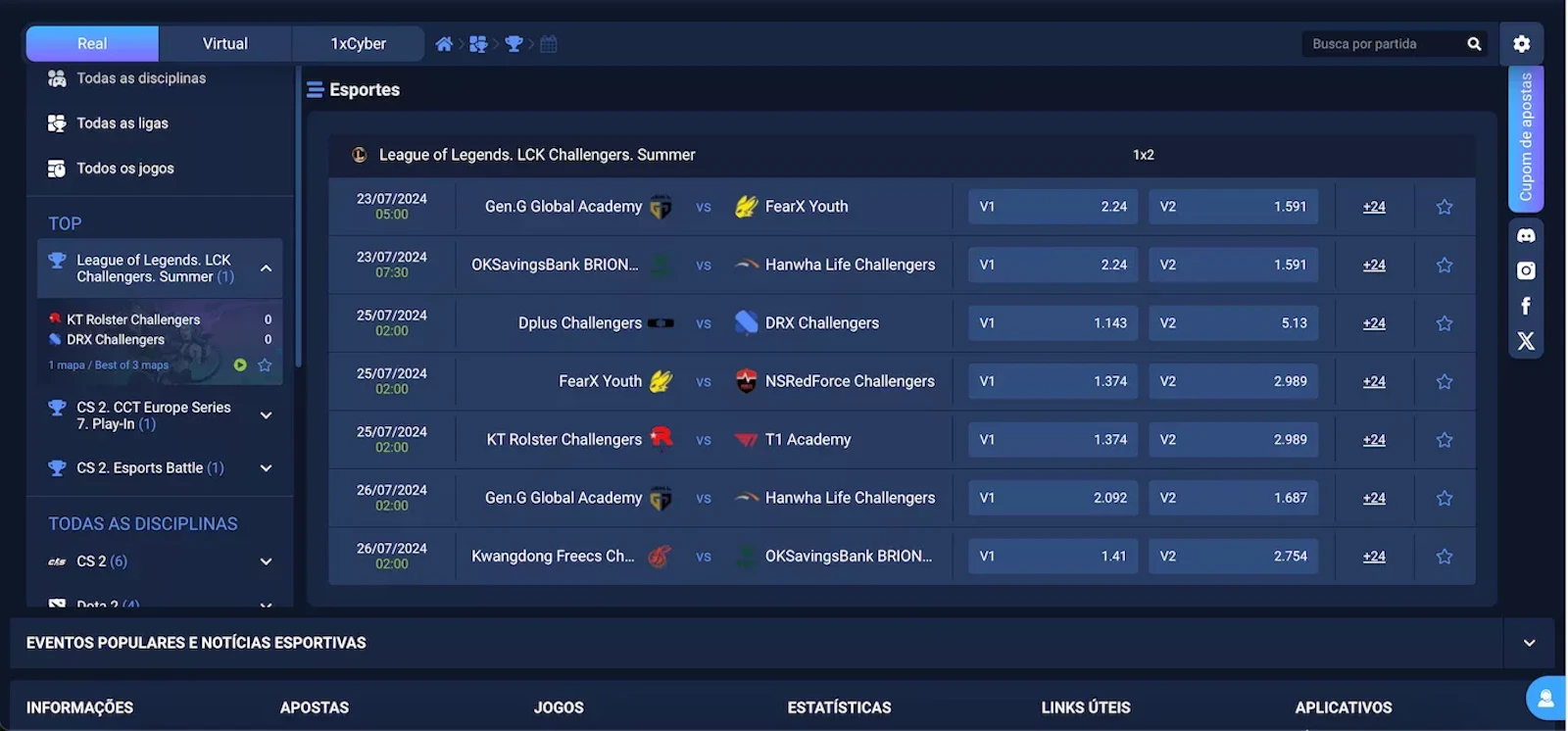 Também nos eSports a marca se destaca pela grande variedade de sua oferta e qualidade de suas odds. Em títulos como Dota 2, CS2 e Valorant, é comum encontrar as odds mais altas do Brasil e mercados que você não acha em lugar nenhum.