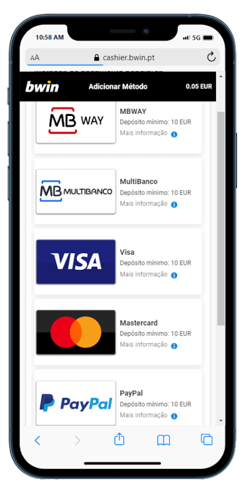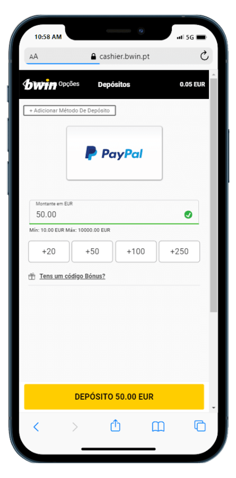 Escolhe o montante que queres depositar e confima. Neste caso depositamos 50€ para aproveitar a oferta de registo da Bwin (aposta grátis de 50€).